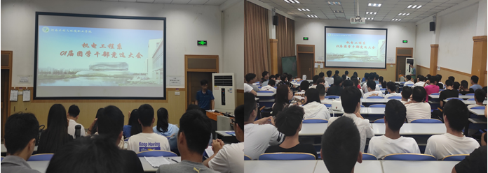 为进一步推进系团学工作,机电工程系于9月15日下午在花园路校区北教一阶召开01届团学干部竞选大会。系党总支书记王建军、学管老师代表参加会议。
