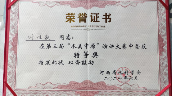 比赛中,叶佳豪同学结合本次“四水同治”主题,用身边的一个个鲜活案例,讲述了自十八大以来中原大地在水利改革发展中取得的辉煌成就,同时也抒发了自己对习近平总书记在黄河流域生态保护和高质量发展座谈会上讲话精神的感想体会。观众们被他的精彩演讲所吸引,场下掌声不断。最终比赛落下帷幕,叶佳豪同学夺得大赛特等奖。