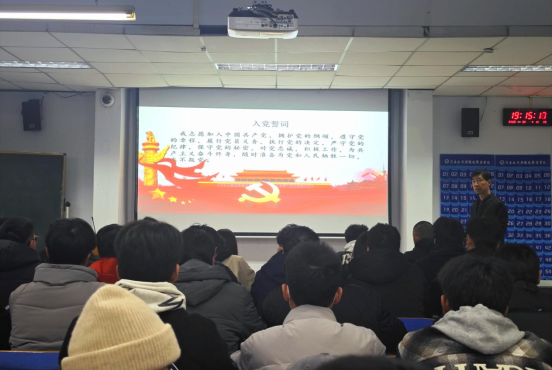 12月11日晚,机电工程系组织2023年第二期入党积极分子在南教205上党课。系党总支书记王建军以《学习党的知识,坚定理想信念》为题,从“政党”、“党的光辉历程”、“党的性质和宗旨”、“党的指导思想”、 “党的最高理想和现阶段奋斗目标”、“党的组织、纪律和作风”、“新时代老员工党员的要求”七个方面为入党积极分子进行讲解,为学员们呈现了一堂集知识性、哲理性、政治性为一体的党课。他勉励学员们笃行进取、遵纪守法、勤俭节约、正直自信,在积极向党组织靠拢的过程中不断增强自我净化、自我完善、自我革新、自我提高的意识和能力。