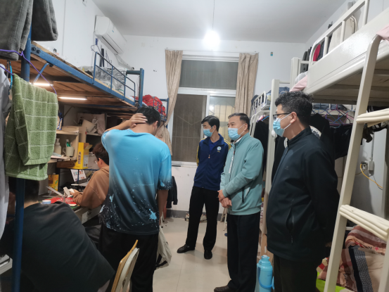 走访中,赵广杰一行来到8号公寓楼,与同学们进行了亲切交流。他询问了封闭管理期间员工的线上学习情况和生活需要,并叮嘱宿舍长做好模范带头作用,减少聚集,注意宿舍通风,关注气候变化,适时增减衣物,加强体育锻炼,做好日常防护。