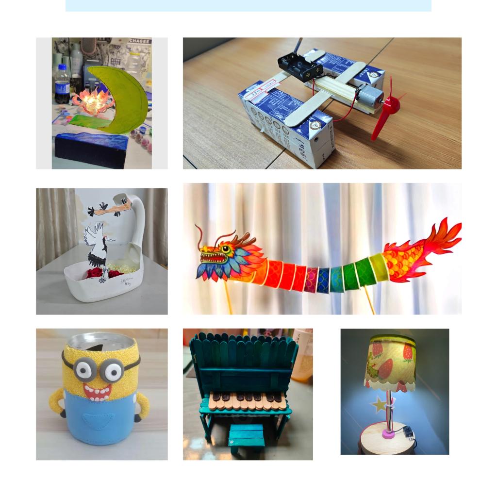 同学们为了更好地发挥废旧物品的再利用价值,积极实践科技环保的理念而绞尽脑汁,各种创意层出不穷:纸板、饮料瓶、废纸、一次性筷子……都成了大家眼中的宝贝,有的作品以精美的外形取胜,“莲花灯”、“小黄人”、“纸杯龙”、“大象”形象逼真;有的作品以生活创意为先,塑料瓶、塑料纸可以变成精致的“台灯”、“笔筒”、“祈愿灯”等;还有的作品充分展示了同学们的科学知识,飞机、纸船......一件件创意作品精美到让人叹为观止。活动最终评选出一等奖3名、二等奖5名、三等奖7名。