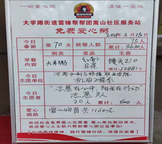 为了引导同学们践行初心使命,奋力担当作为,515日清晨,机电工程系组织青年志愿者们到大学路街道雷锋帮帮团嵩山社区服务站开展“爱心粥屋献爱心,志愿服务暖人心”社会志愿服务活动。
