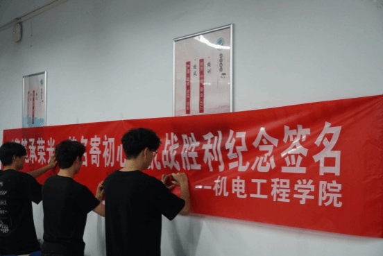 活动当天,三项活动同步推进,现场氛围庄严又热烈。在花园里校区南苑大礼堂,组织员工观看盛大的阅兵仪式直播,这场气势恢宏、意义非凡的盛典,不仅是对历史的深情回望,更是对未来的庄严宣誓,在全体师生中引发强烈共鸣和深刻思考。“铭记抗战史,答题忆峥嵘”抗战胜利知识答题活动中,参加活动的同学从提前准备好的涵盖抗战重大历史事件与抗战英雄人物的题目卡中有序抽取题目进行作答,同学们以问答回望峥嵘岁月,在答题的互动过程中深化了对伟大抗战精神的理解;“落笔承荣光,签名寄初心”抗战胜利纪念签名活动里,同学们或郑重的在横幅上签下自己的姓名,或写下祝愿祖国繁荣昌盛的寄语,以笔墨传递对历史的缅怀与对和平的珍视。活动结束后,志愿者们进行了合影留念,本次抗战胜利纪念日系列活动在庄重的氛围中圆满落下帷幕。